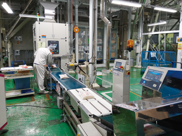 自動計量包装機で袋詰めした後、ウェイトチェッカー・金属検出機等で最終確認を行います。